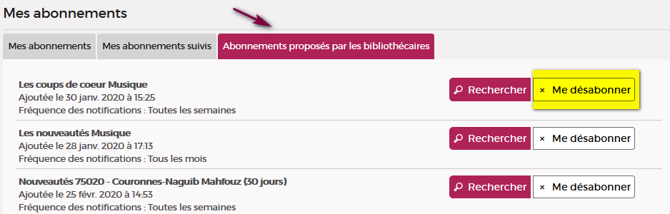 - Vous pouvez retrouver l'ensemble des alertes thématiques auxquelles vous êtes abonné en consultant la rubrique "Mes abonnements" dans votre compte. En cliquant, sur "Abonnements proposés par les bibliothécaires", vous découvrirez de nombreuses propositions d'alertes auxquelles vous pouvez vous abonner.