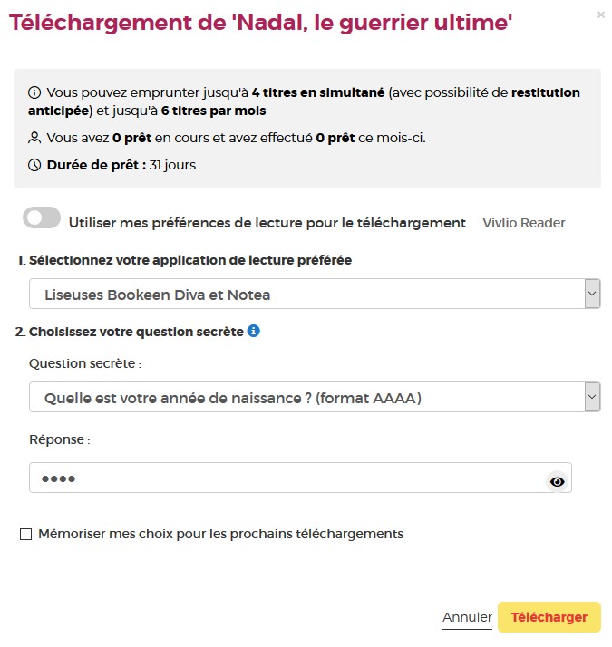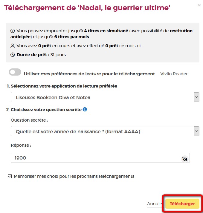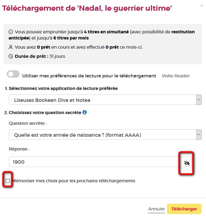 Vous pouvez cocher l’icône en forme d'œil à droite de votre réponse pour vérifier que vous avez bien tapé votre date de naissance. N’hésitez pas à cocher Mémoriser mes choix pour les prochains téléchargements afin de ne plus avoir à remplir le formulaire les prochaines fois. Vous pourrez le modifier par la suite si vous changez d’appareil ou d’application de lecture dans votre compte usager.