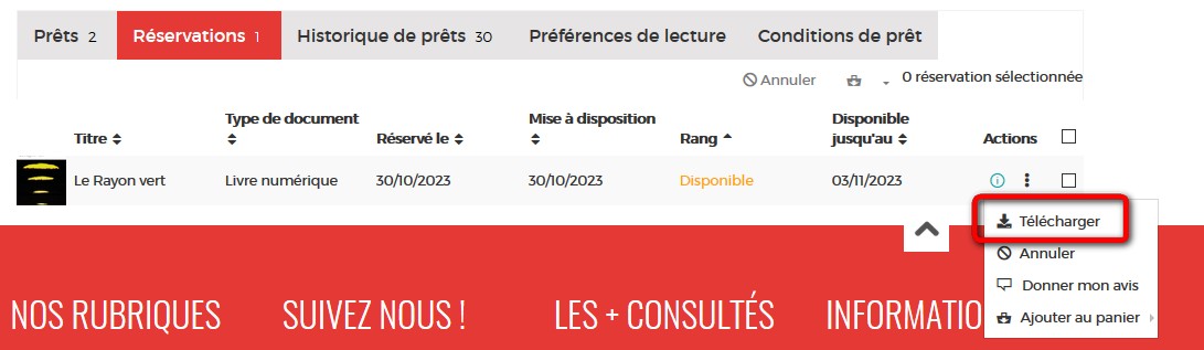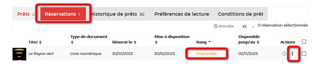 Rendez-vous sur l'onglet Réservations. Vous y trouverez la liste des ouvrages que vous avez réservés. Par défaut, la réservation est configurée suivant les préférences de lecture de votre appareil ou, à défaut, avec une DRM Adobe. Vous pouvez ajuster ces paramètres si nécessaire. Repérez la réservation maintenant disponible et cliquez sur l'icône correspondante