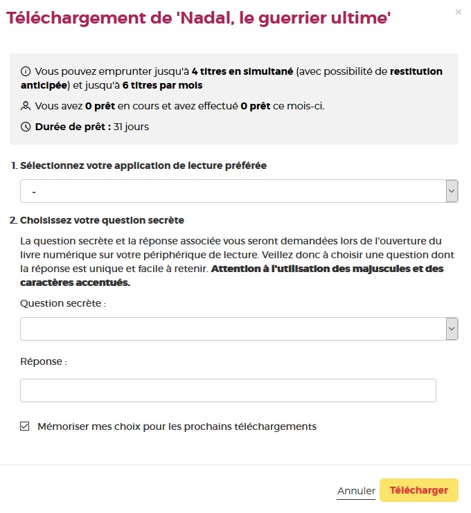 Vous pouvez cocher l’icône de l’œil à droite de votre réponse pour vérifier que vous avez bien tapé votre date de naissance. N’hésitez pas à cocher Mémoriser mes choix pour les prochains téléchargements afin de ne plus avoir à remplir le formulaire les prochaines fois. Vous pourrez le modifier par la suite si vous changez d’appareil ou d’application de lecture dans votre compte usager.