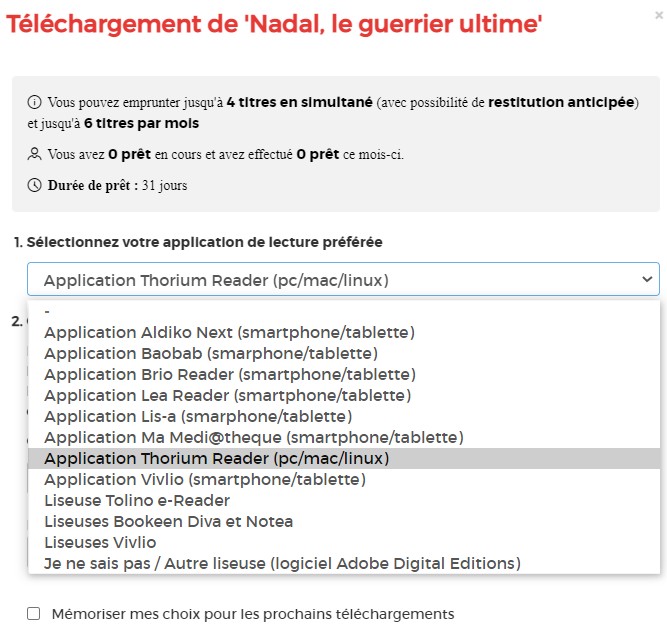 Première étape, choisissez votre appareil ou votre application de lecture. Choisissez Thorium Reader (pc/mac/linux).