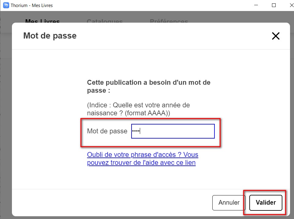 En cliquant sur la couverture du livre, une fenêtre d'authentification s’ouvre. Rentrez votre année de naissance enregistrée lors de l’emprunt puis cliquez sur Valider.